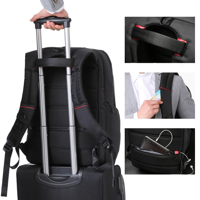 Mochila executiva fashion, customizada com cadeado TSA, recarregável de grande capacidade (USB externo) e multifuncional.